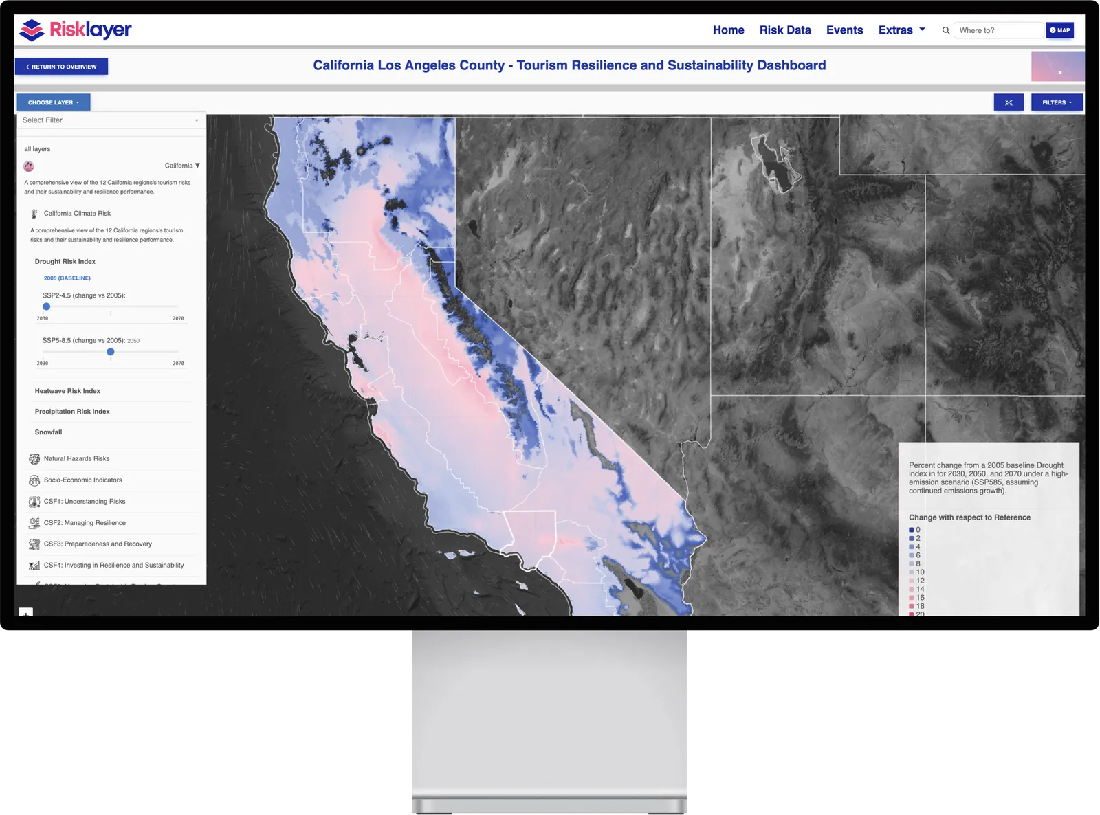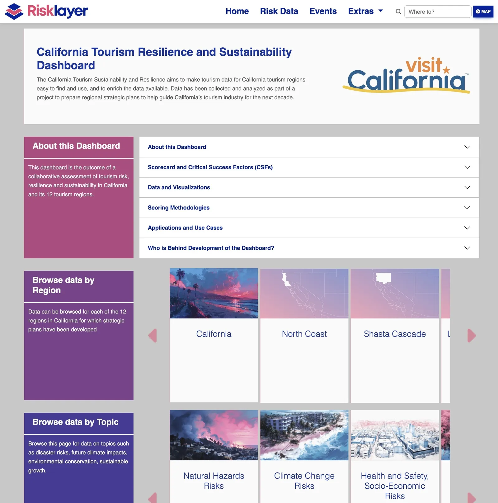 Visit California is pioneering destination resilience through a groundbreaking collaboration with Risklayer (Hotel Resilient’s parent company) and JLL. Together, we have developed the California Regional Tourism Sustainability and Resilience Dashboard, a comprehensive tool that equips tourism stakeholders with critical data on natural hazards, climate projections, and sustainability metrics.